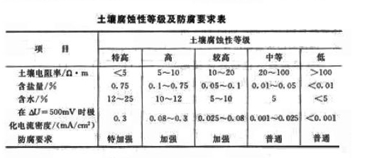 土壤腐蝕影響影響著土壤的電阻率,因此在選址時應(yīng)適當(dāng)考慮土壤腐蝕性與電阻率的關(guān)系,土壤腐蝕性等級及防腐要求如下表。
