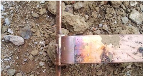 銅導(dǎo)線與銅帶搭接長度應(yīng)至少20毫米;幾塊接地體(銅板)之間的連接也應(yīng)搭接銅焊,銅板的搭接長度至少為50毫米,并進(jìn)行兩面焊接。焊縫應(yīng)平整、飽滿,無明顯氣孔及缺陷,焊接處的焊渣必須清除。